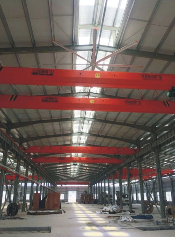 我公司生產的大型工業吊扇直接懸掛在廠房屋梁下,風力柔和,能加快車間空氣流通,有效降低車間內溫度,改善車間空氣環境質量,有利于員工的身體健康。